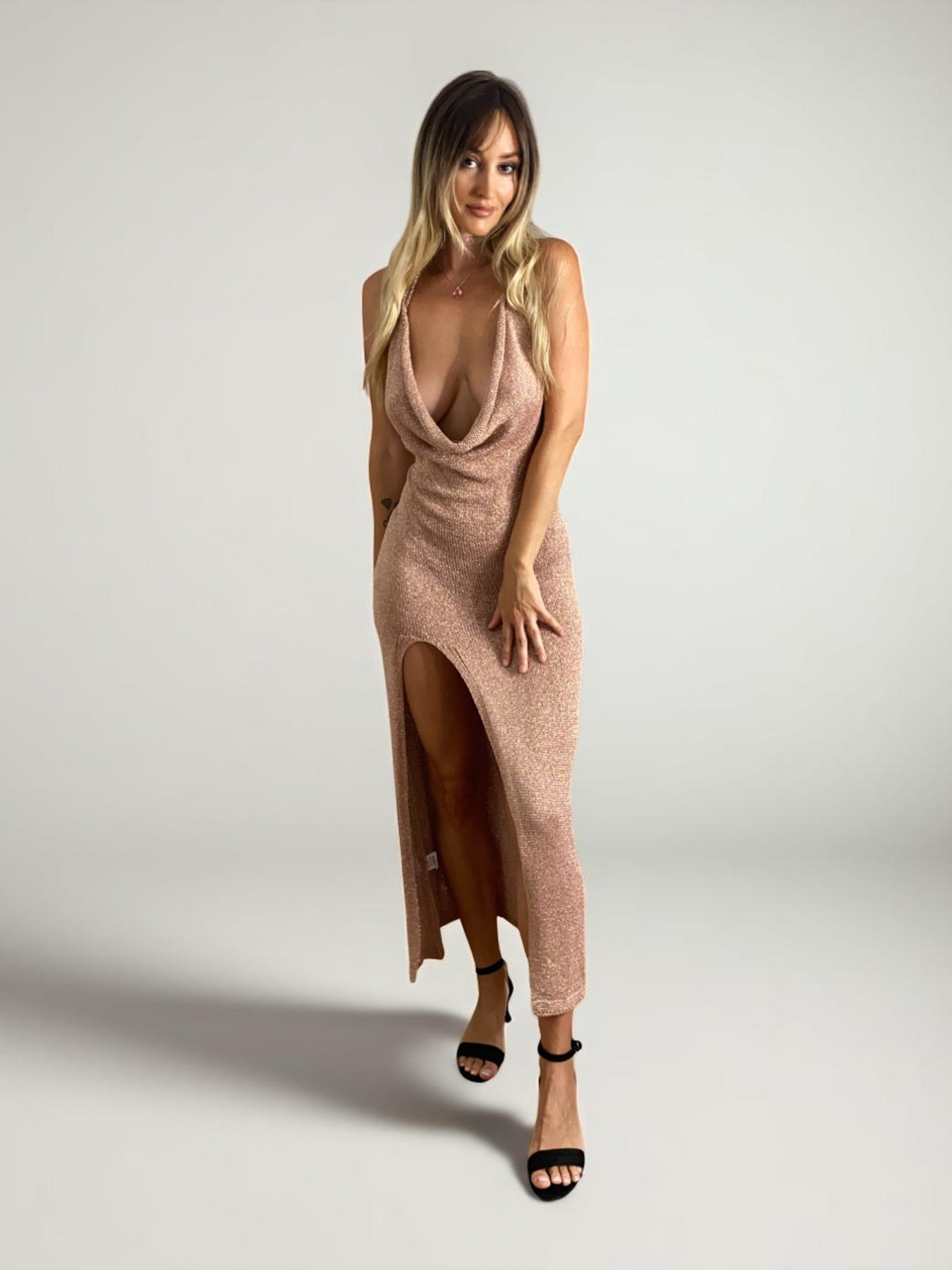 Vestido largo de corte fluido con abertura en la pierna, escote caído y un suave brillo que aporta un toque de elegancia y sensualidad.