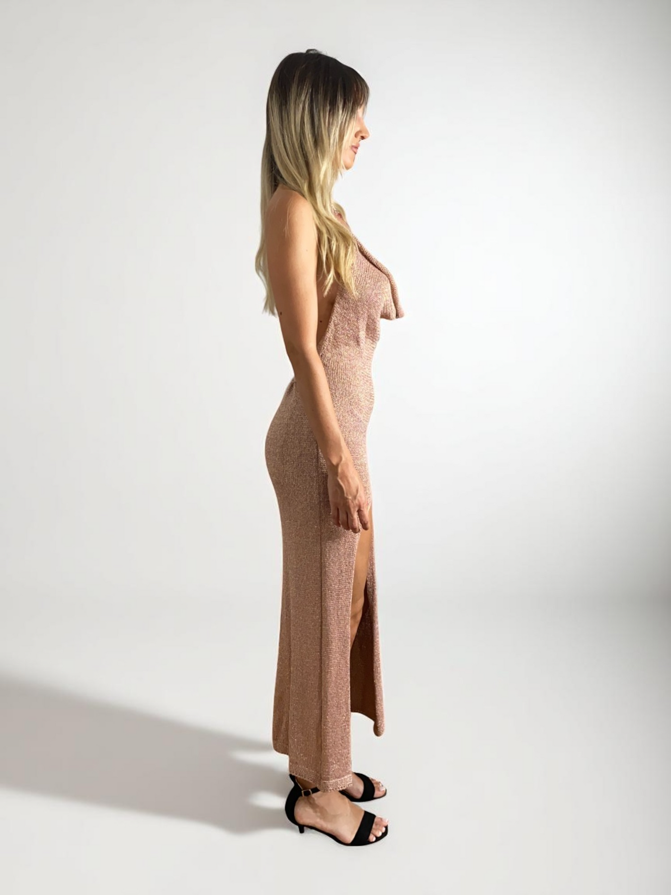 Un diseño espectacular para brillar en días y noches de verano. Vestido largo de corte fluido con abertura en la pierna, escote caído y un suave brillo que aporta un toque de elegancia y sensualidad.