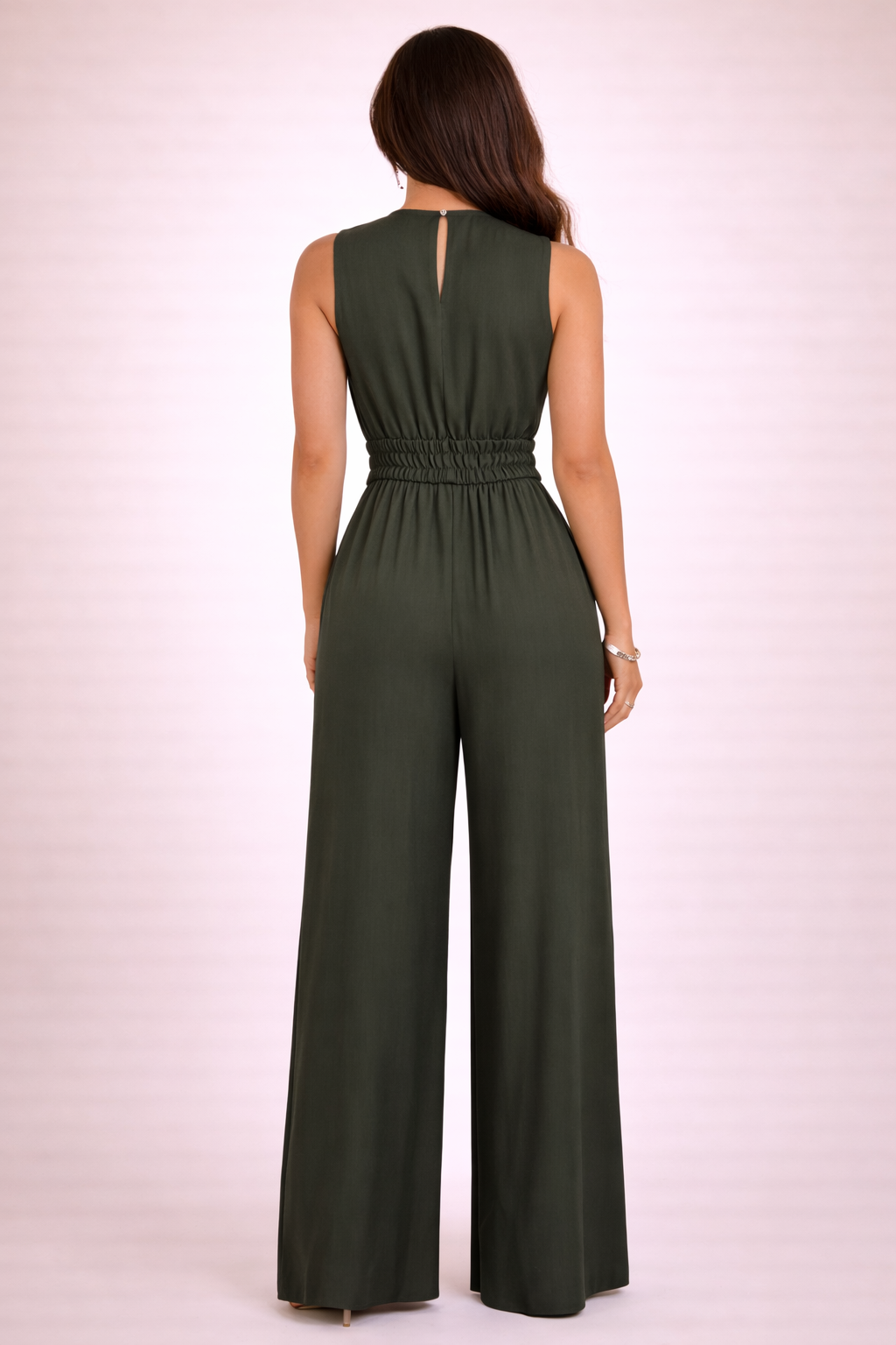 The Éloria Jumpsuit is a refined one-piece designed for easy sophistication from day to night. Featuring a deep V-neckline, a defined tie waist, and wide-leg trousers, this piece is designed to create an effortlessly elevated look. The gathered back waist enhances the silhouette, while the soft drape adds comfort and movement. Perfect for vacations, dinners, events, and polished everyday styling, this jumpsuit offers timeless elegance with a modern feminine feel.